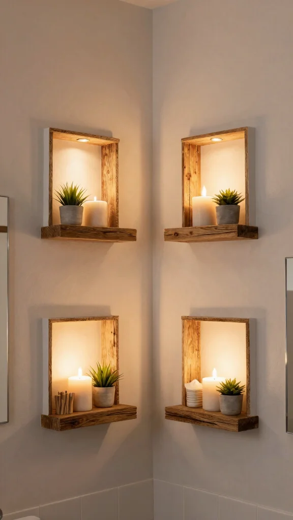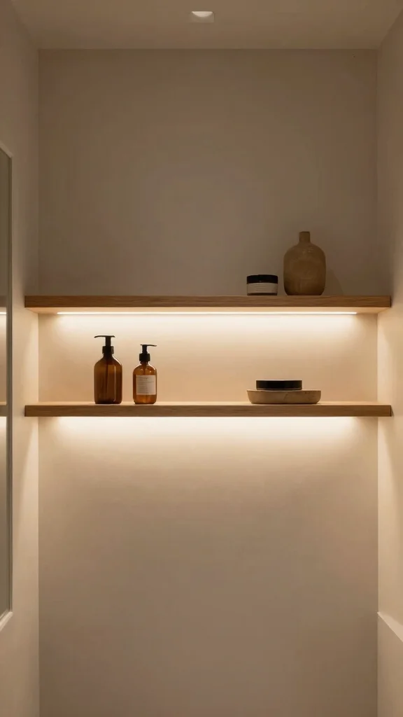 For a truly modern touch, consider floating shelves with integrated lighting. This innovative design not only showcases your decor but also adds a warm glow to your bathroom, creating an inviting atmosphere.