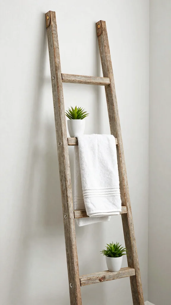 A decorative ladder with hooks serves as both a functional storage solution and a statement piece in your bathroom. This unique design adds charm while keeping towels and robes readily accessible.