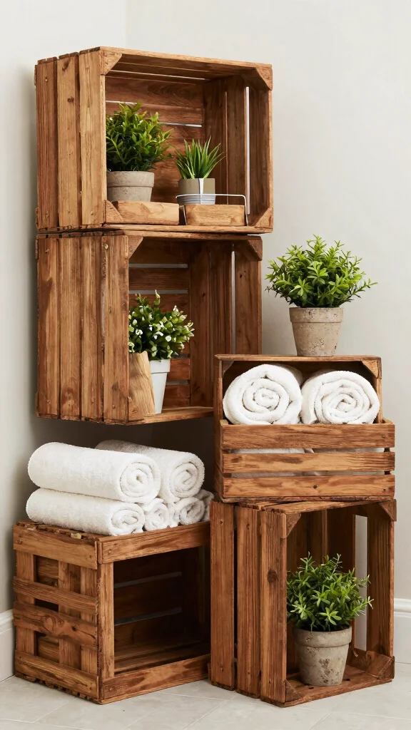 Vintage wooden crates prove that storage can be stylish; no pricey cabinets needed. Stack or hang them to create bathroom decor shelves that hold rolled towels and essentials, all while adding rustic charm. Budget-friendly, practical, and totally share-worthy.