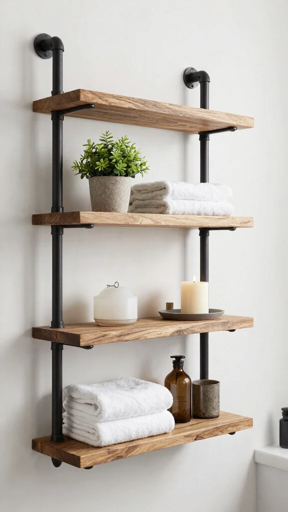 Rustic pipe shelves bring an industrial edge to your bathroom while offering durability and functionality. The combination of wood and metal pipes creates a striking visual impact, making these shelves a statement piece.
