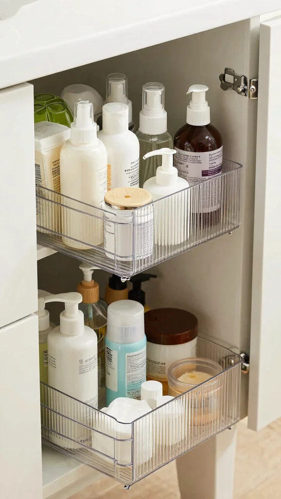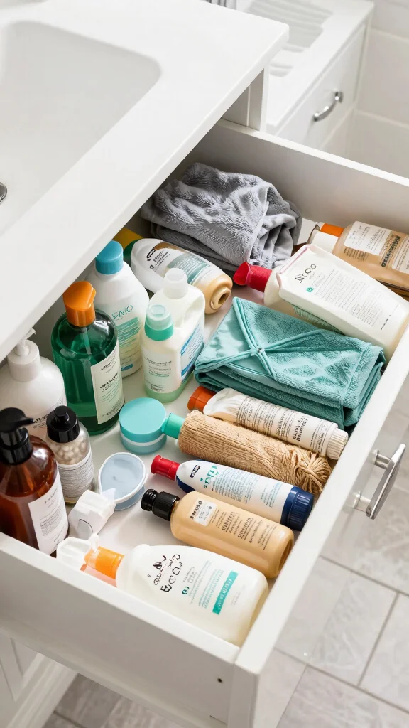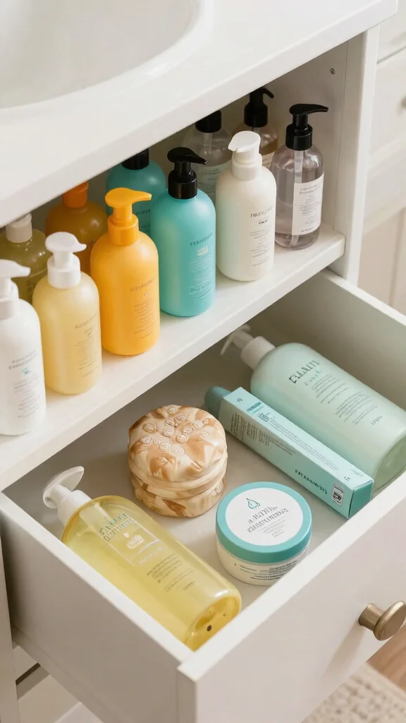 Group items by category (daily essentials, backups, skincare) and keep the most-used items in the front for quick access. This bathroom storage solutions approach supports space-saving storage ideas and a cleaner, clutter-free bathroom.