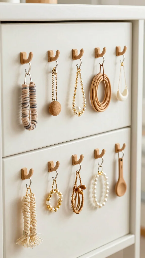 Opt for hooks made from sustainable materials to maintain an eco-friendly approach, placing them strategically along the drawer edges for optimal access.