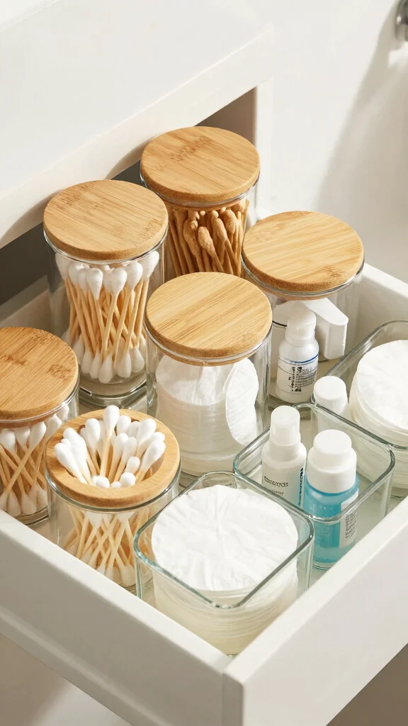 Opt for containers with bamboo lids for an extra touch of sophistication. The transparency of glass allows you to quickly find what you’re looking for, making your bathroom feel organized and stylish.