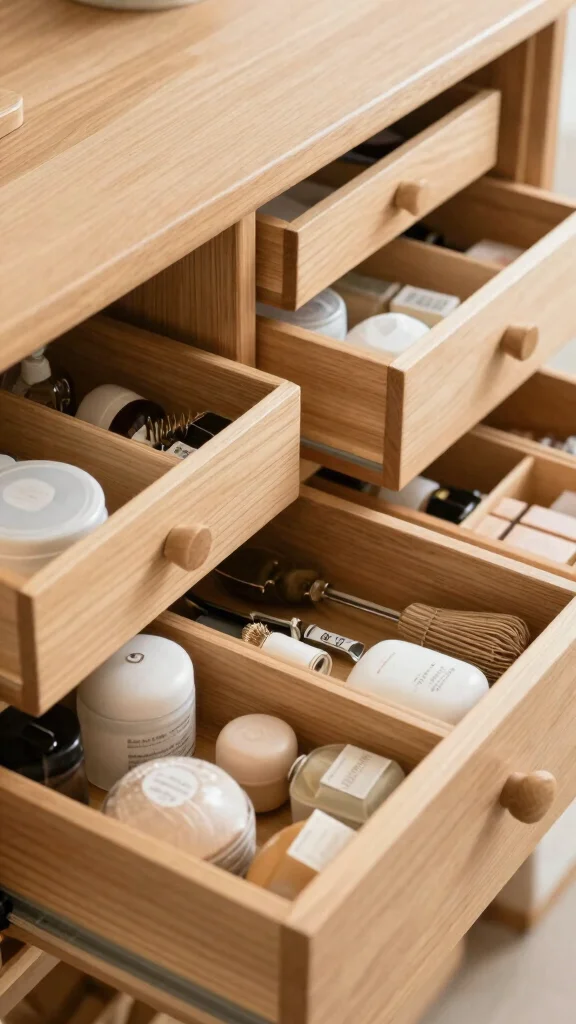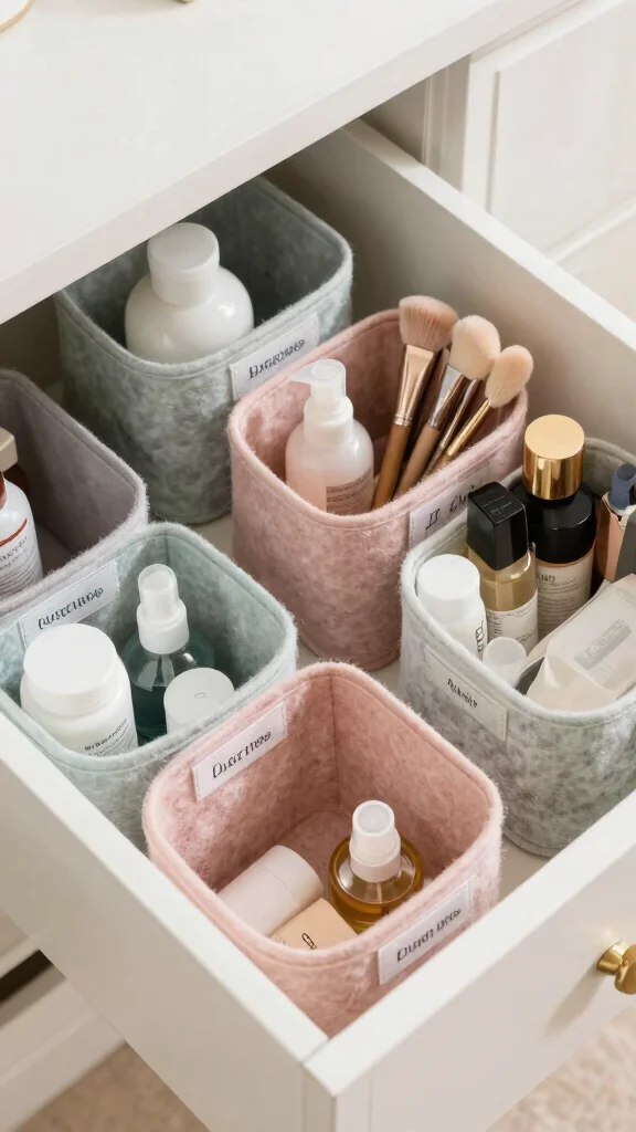 Measure your drawers and select adjustable dividers to create dedicated zones for daily items, backups, and cosmetics.