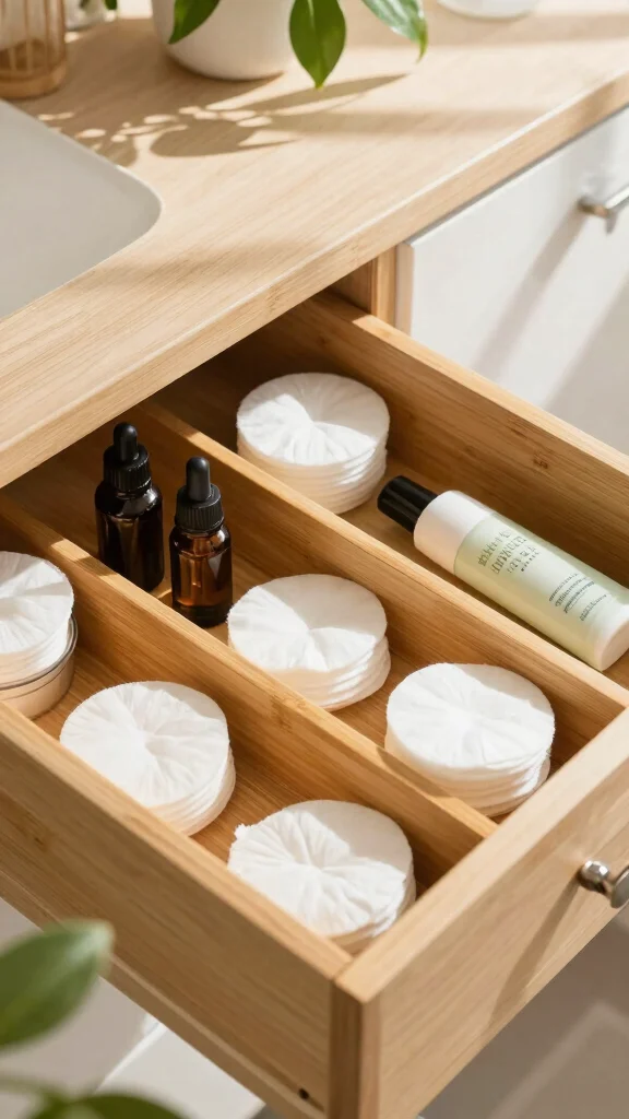 Choosing the right eco-friendly drawer organizers can transform your vanity. Look for materials like bamboo, FSC-certified wood, or recycled plastic that are durable and low-waste. Invest in adjustable drawer dividers for bathrooms so you can customize partitions for makeup, toiletries, and tools. Group items into zones (daily-use, backups, seasonal products) and label each section for quick finds. Keep waste low by avoiding plastic wrap and opting for reusable containers. This is a practical path to bathroom drawer organization and vanity organization tips that last.
