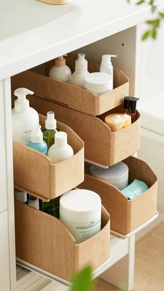 These dividers enable you to utilize vertical space effectively, especially in deeper drawers. Layering them allows you to store more while maintaining easy access to essentials. This choice reflects a commitment to the environment while enhancing the warmth of your bathroom decor.