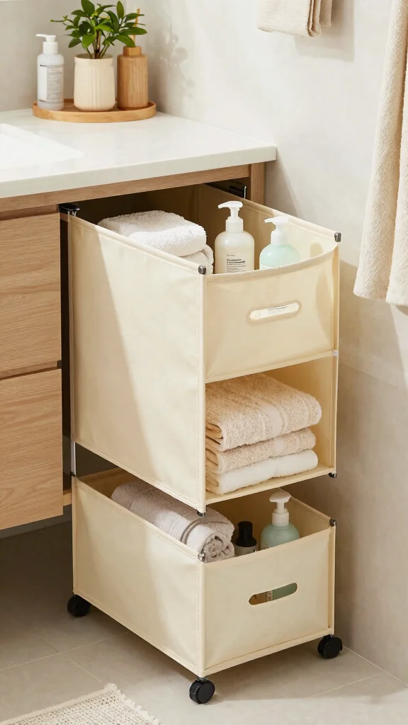 Choosing fabric over plastic not only reduces environmental impact but adds warmth and texture to your bathroom. For a visually appealing arrangement, use smaller bins inside larger ones to create an efficient tiered effect.