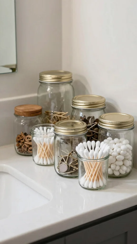 Mason jars are a fantastic solution for organizing small items in your bathroom, from hairpins to cotton swabs. They offer visibility while adding a rustic charm to your decor. Grouping jars together in drawers or on counters creates a tidy and attractive arrangement.