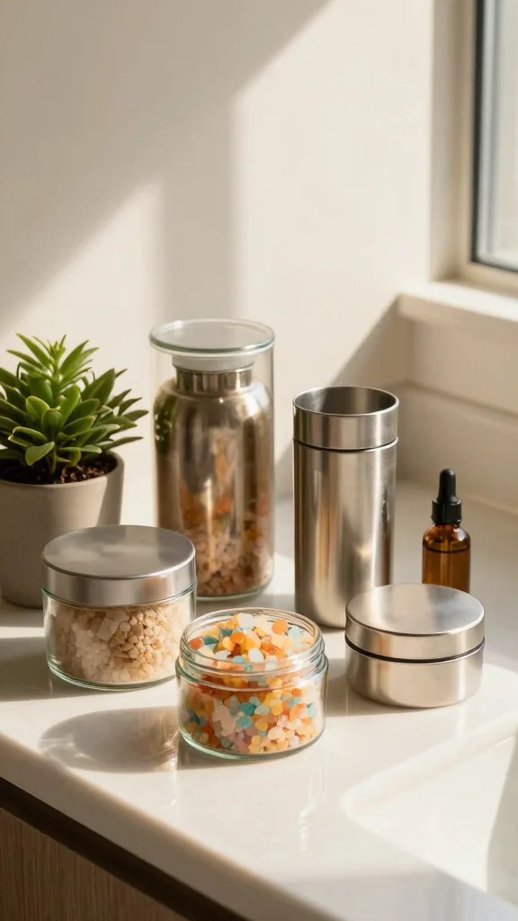 Switching to reusable containers in your bathroom is a smart and stylish choice. Opt for glass or stainless steel options that not only look sophisticated but also contribute to sustainability. These containers can hold everything from skincare products to hair accessories, providing both function and flair.