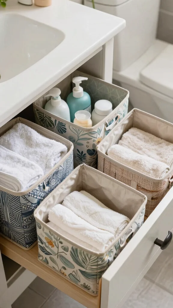 Incorporating fabric bins can introduce cheerful colors into your bathroom, transforming it into a vibrant and inviting space.