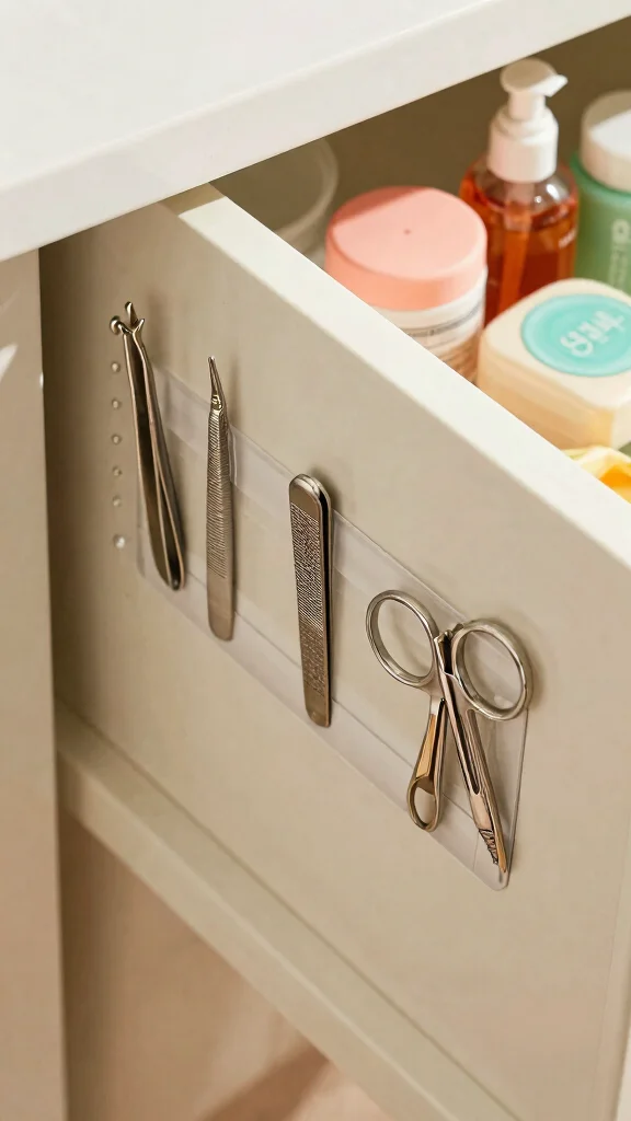 Fun fact: magnetic strips can reclaim up to 30% of drawer space by keeping tweezers, scissors, and clippers visible and reachable. Pair this with eco-friendly, sustainable strips for a tidy vanity and a truly eco bathroom drawer organization.