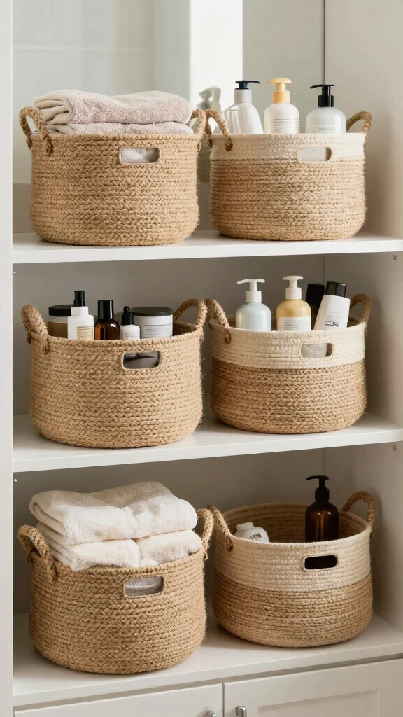 Choosing natural materials elevates your bathroom’s aesthetic while allowing you to repurpose items you already have at home. It’s a practical way to keep things tidy and stylish.