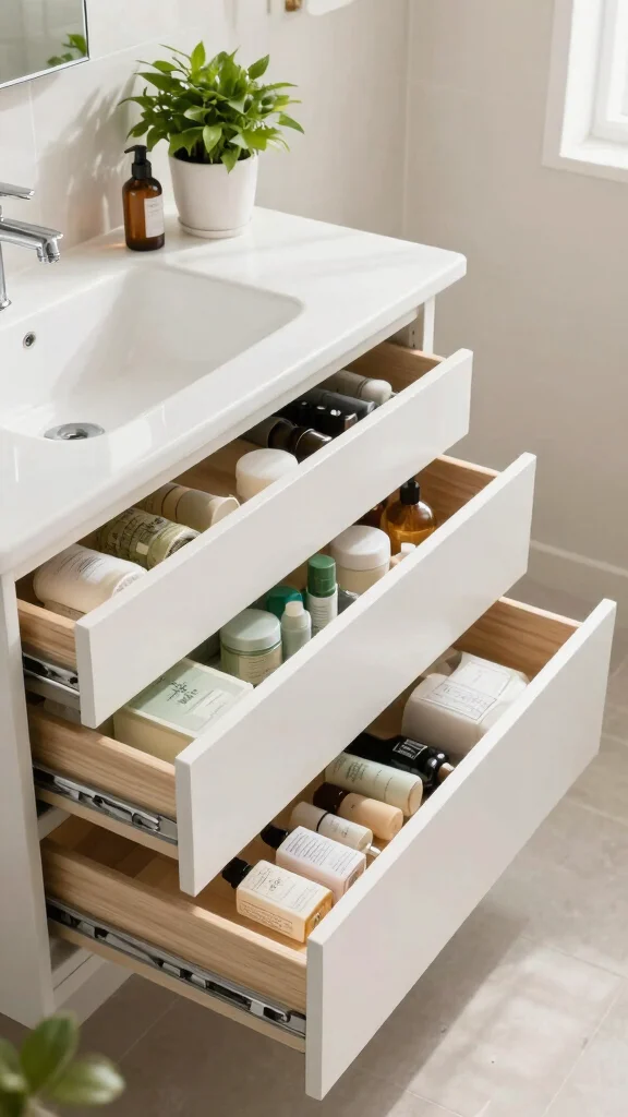 Incorporate hanging organizers into your bathroom drawers to take advantage of vertical space. These organizers can be attached to the sides of the drawer, holding small items like razors or hair clips securely while keeping your drawers clutter-free.