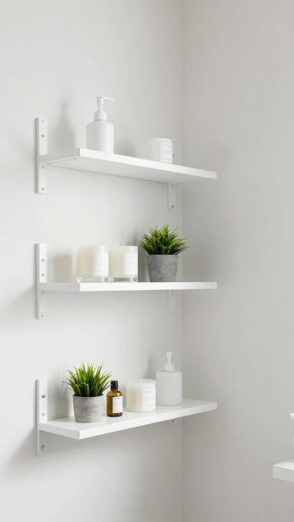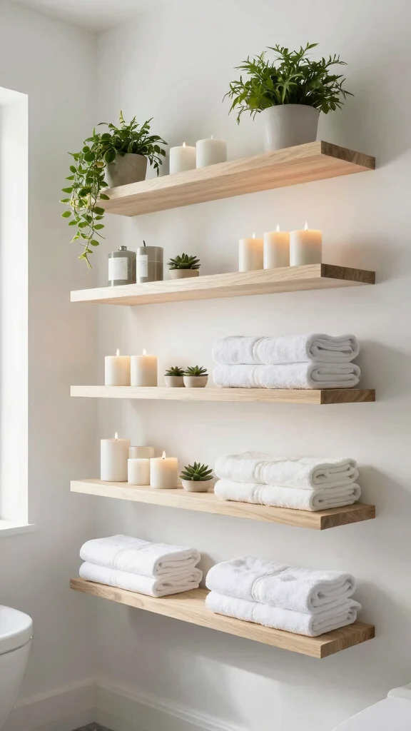 Wall-mounted floating shelves offer a minimalist solution to your bathroom storage challenges. These sleek designs are perfect for tight spaces, providing a clean and organized look. Whether you want to display favorite candles or store essential items, wall-mounted shelves keep everything neat and accessible while being easy to install.