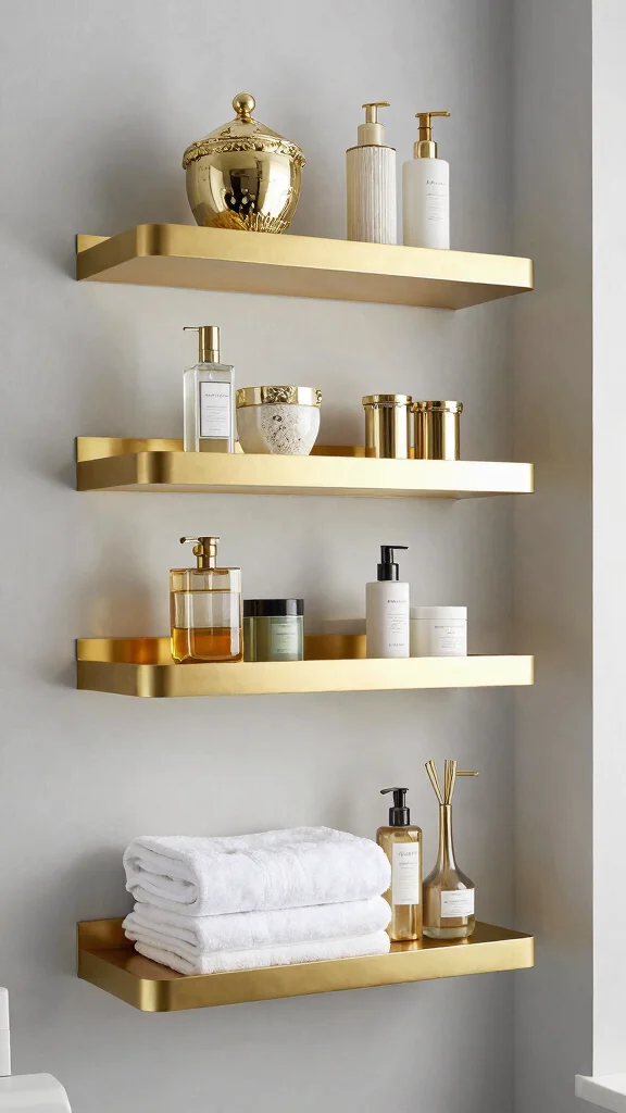 Elevate your bathroom decor with decorative metallic floating shelves that bring a hint of glamour. Available in finishes like gold, silver, or copper, these shelves add sophistication and shine to your space. They are perfect for showcasing elegant decor items, perfumes, or luxury towels, seamlessly blending with various styles from modern to bohemian.