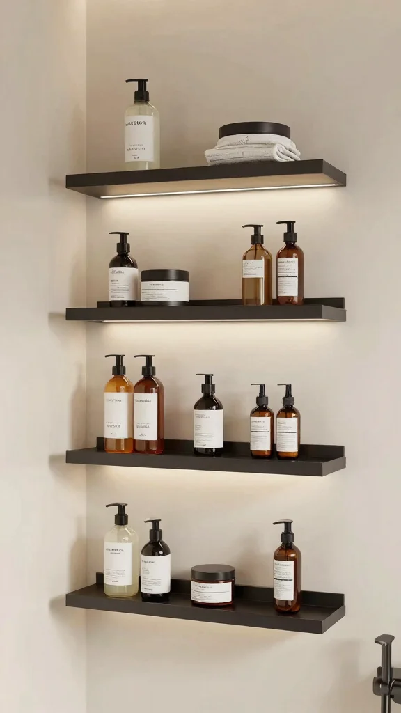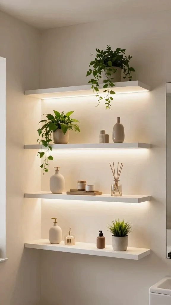 Transform your bathroom with floating shelves featuring built-in lighting that creates a stunning visual effect. This innovative design not only showcases your items beautifully but also adds a cozy ambiance to your space. Perfect for highlighting decorative elements or essential items, these shelves can become a focal point in your decor while enhancing visibility.