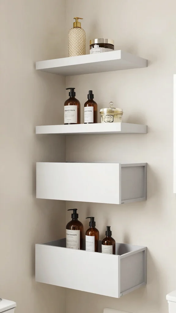 Lastly, consider multi-functional floating shelves that seamlessly combine storage and style. These shelves often include drawers or hidden compartments, making them ideal for small bathrooms where space is at a premium. Their versatile design allows you to maximize every inch while keeping your items concealed and organized.