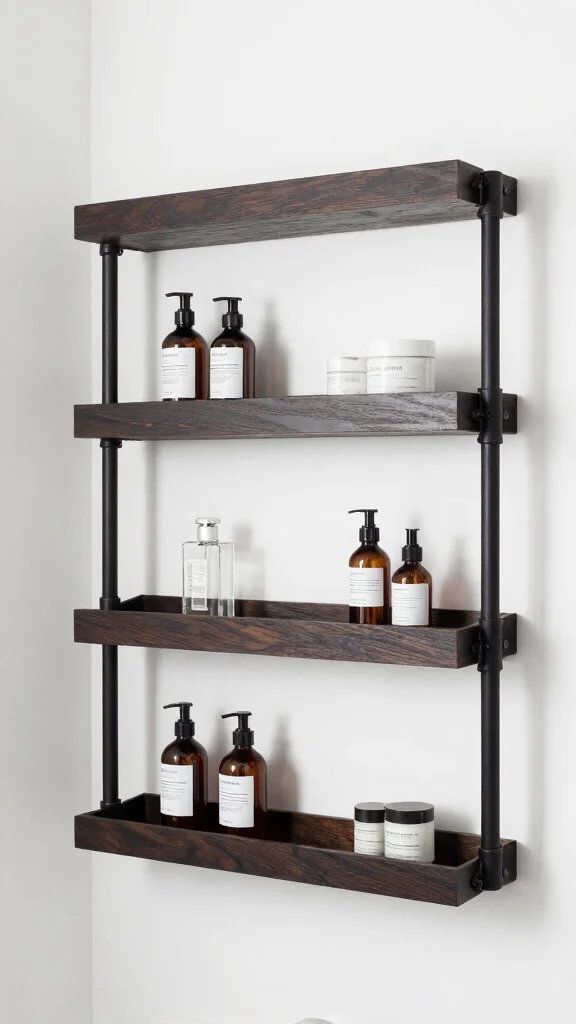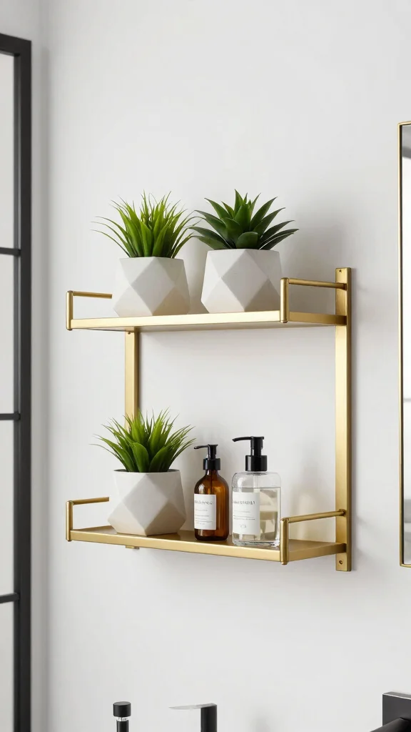 Minimalist Metal Floating Shelves keep your bathroom organized and chic. For a modern touch, bathroom floating shelves with matte black or brushed gold finishes pair with geometric planters and glass containers.