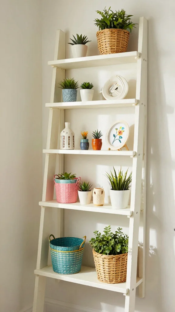To style ladder shelves effectively, consider using colorful baskets on the lower rungs for extra organization. Hanging towels from the rungs ensures easy access, while decorative items like candles and artwork can personalize the display.