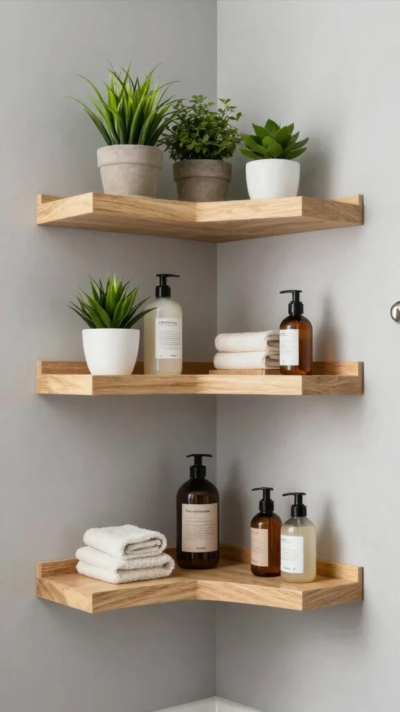 Maximize your space with corner floating shelves designed to fit snugly into your bathroom’s corners. These clever designs provide ample storage without compromising style, making them perfect for showcasing plants, toiletries, or decorative accents that add character to your space. With a variety of materials available, finding the perfect match for your decor is easy.