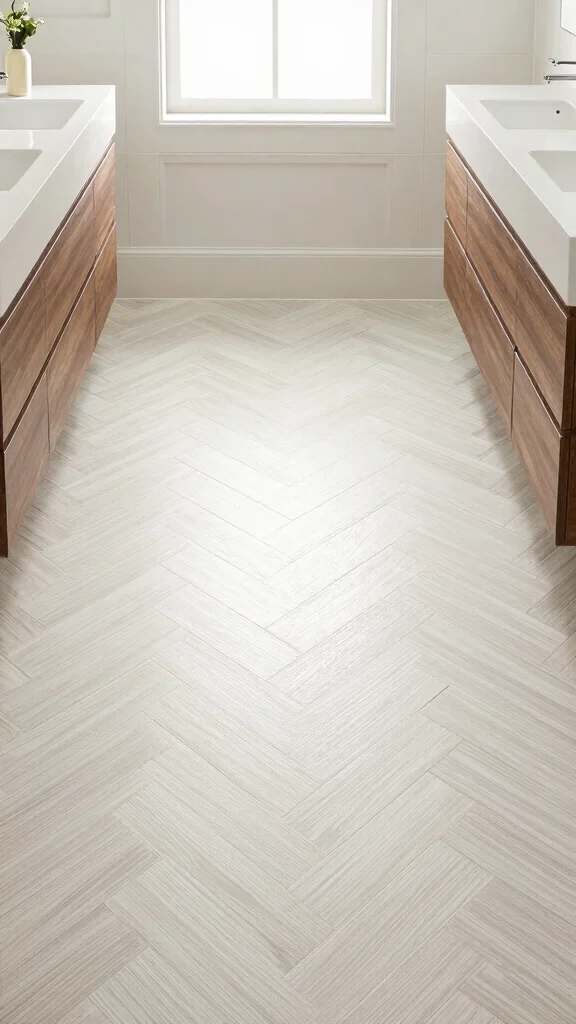 Herringbone elevates bathroom floor ideas with timeless style. Start small: choose a color that harmonizes with your fixtures, and consider contrasting grout to make the pattern pop—even in compact spaces.