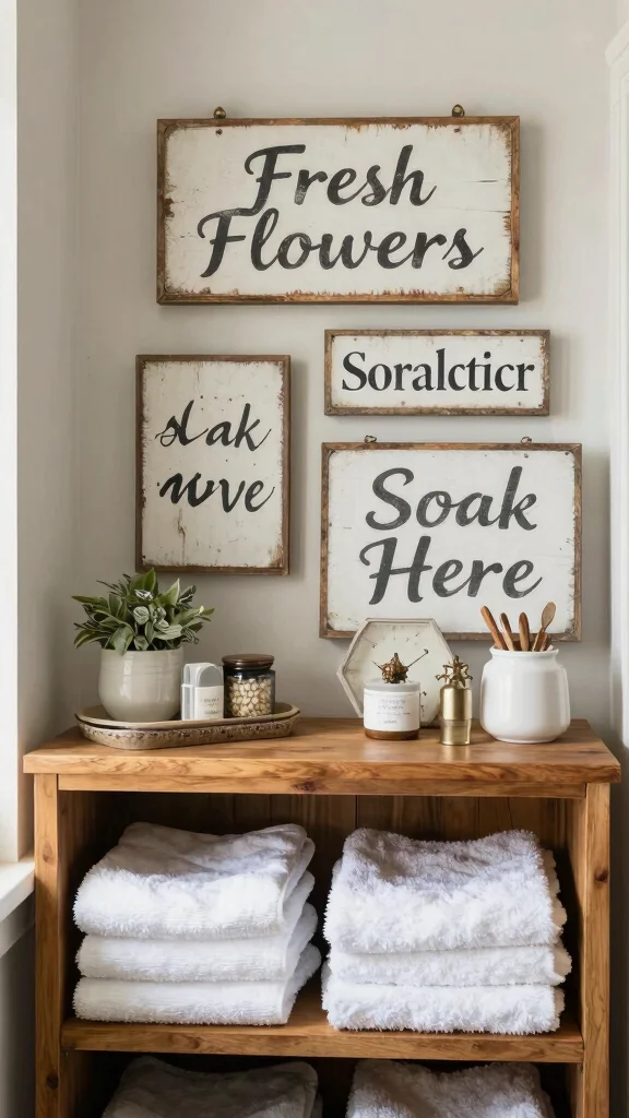 Farmhouse signage adds a delightful personal touch to your bathroom shelves, reinforcing the curated aesthetic.