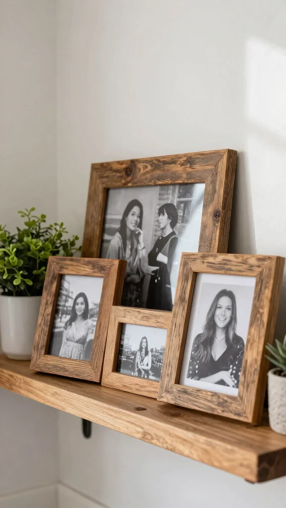 Personalized photo frames infuse a sentimental touch into your bathroom decor, enhancing the rustic farmhouse aesthetic. Displaying cherished memories on your shelves creates a warm, inviting space. Opt for wooden frames to maintain the rustic vibe while varying sizes and styles for a curated look.