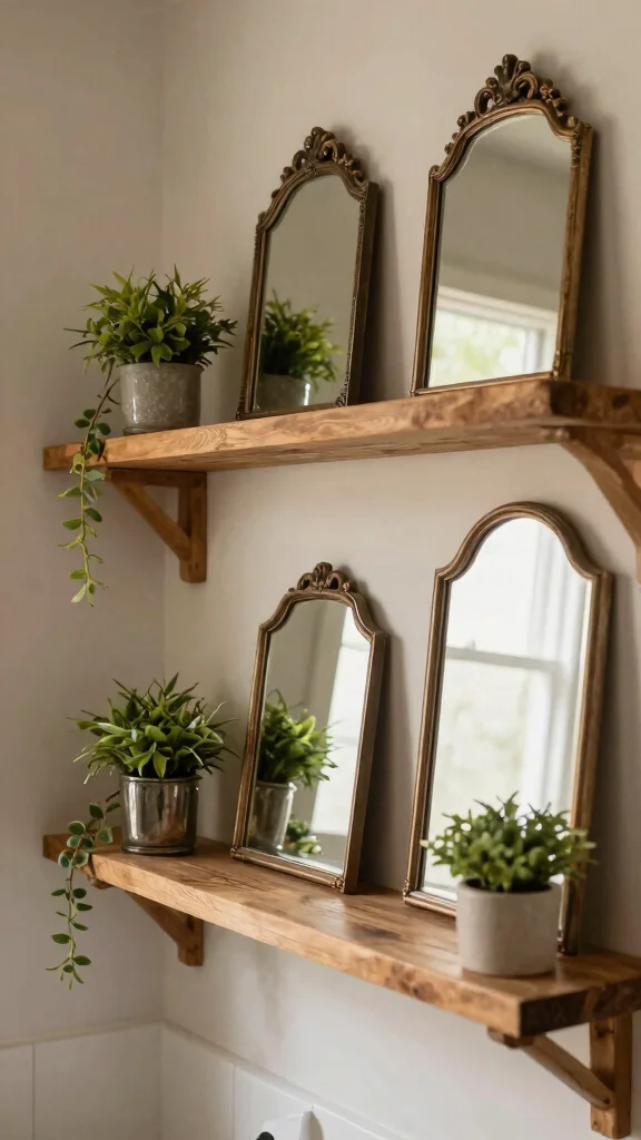 Mirrors serve both practical and decorative purposes, adding depth and light to your bathroom decor. Incorporating mirrors on your shelves or above them creates an illusion of space while reflecting natural light. Vintage-style mirrors with ornate frames enhance the rustic feel beautifully.