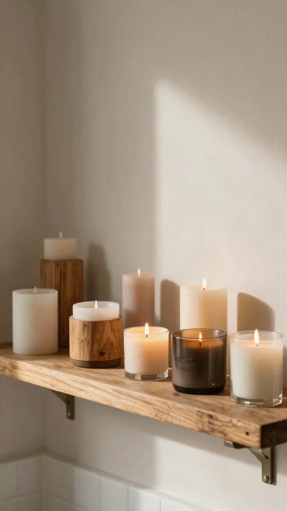 Candles enhance your bathroom shelves with warmth and ambiance. Available in diverse sizes, shapes, and scents, they offer versatility for any style. Pairing rustic containers with beautifully shaped candles elevates your decor while creating a calming atmosphere.