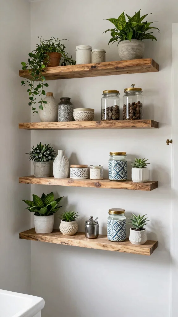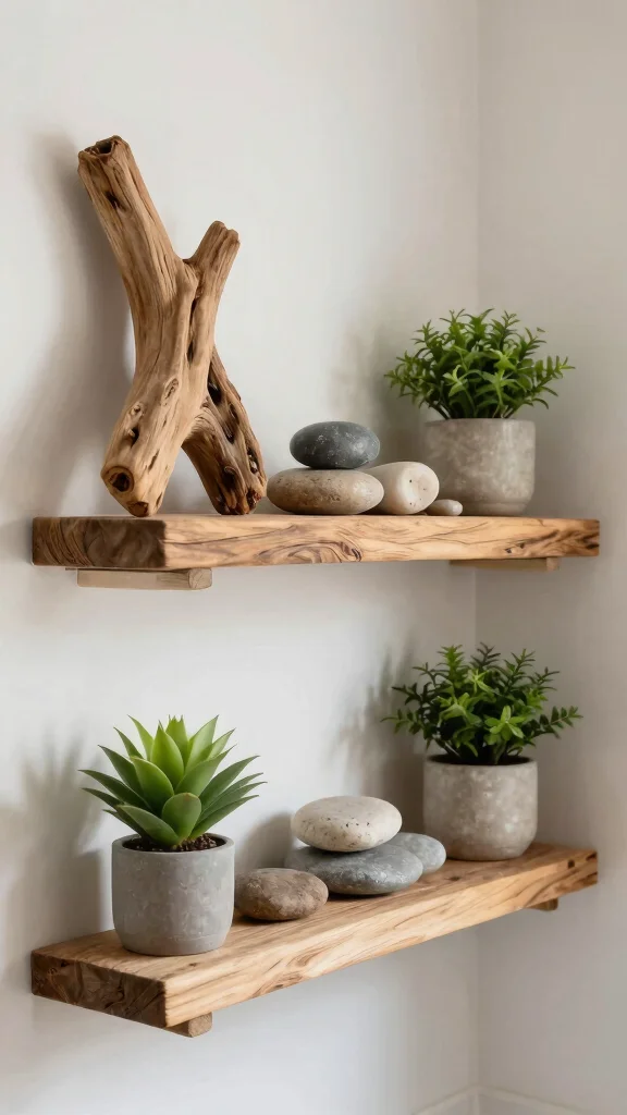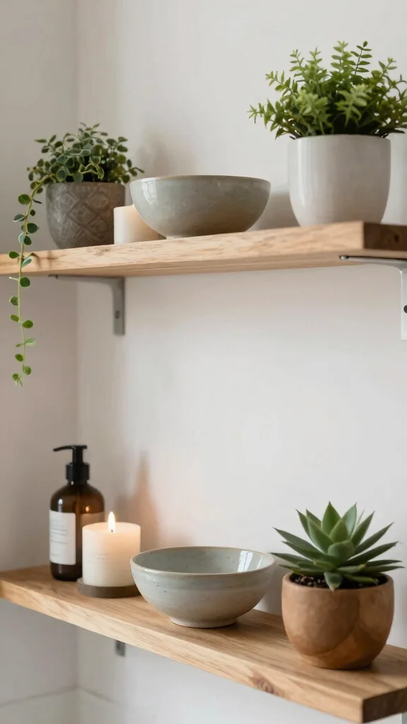 Integrating natural elements makes your shelves feel alive and grounded, enhancing your bathroom’s overall ambiance.