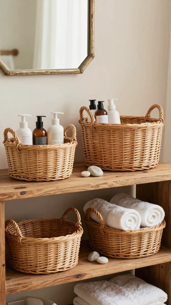 The combination of functionality and elegance makes woven baskets an ideal addition to your bathroom decor.
