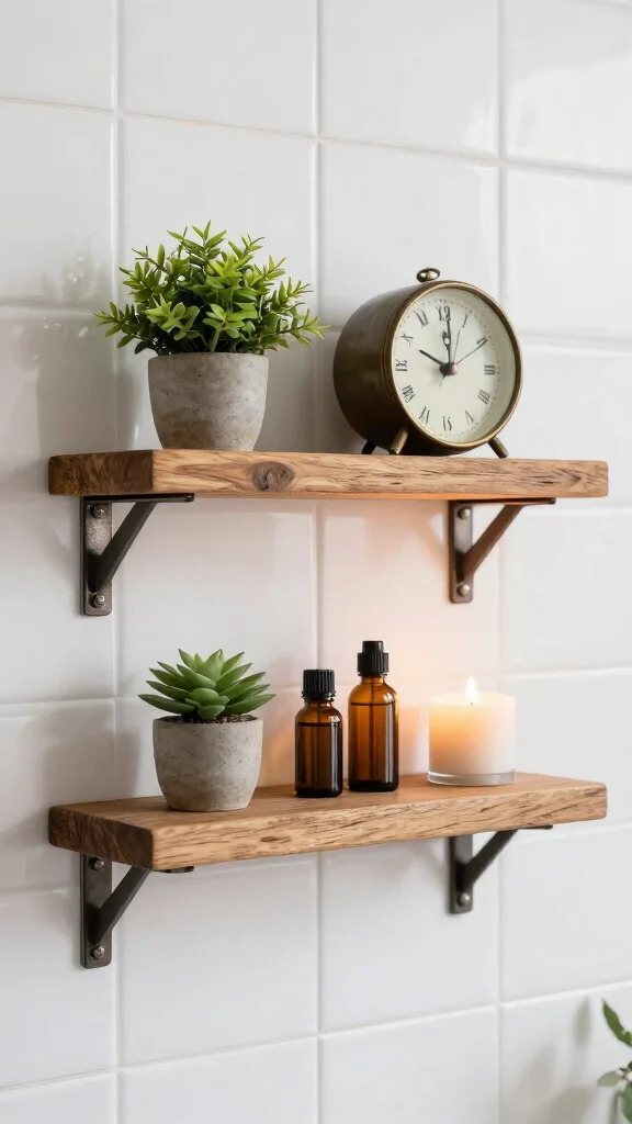 Combining rustic wood shelves with metal accents creates a striking, modern contrast that enhances your bathroom aesthetics. Consider using aged barn wood for shelves and pairing them with sturdy metal brackets or pipe fittings. This combination not only looks stunning but also provides robust support for your favorite decor pieces.