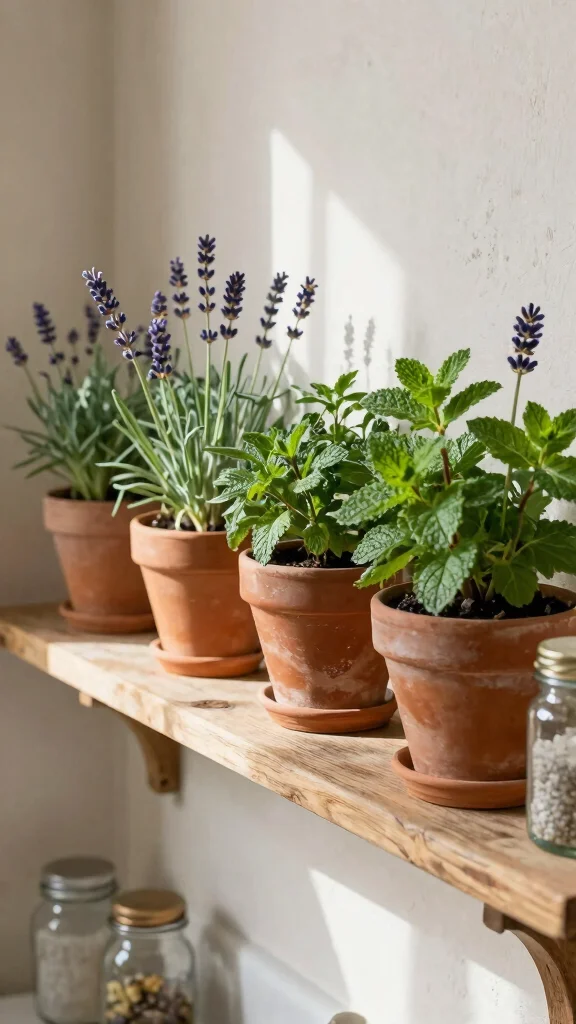 Transform your bathroom shelves into a delightful mini herb garden for a refreshing touch. Using small pots or terrariums to house herbs like mint, rosemary, or lavender not only elevates your decor but fills your space with wonderful fragrances. This idea beautifully blends functionality with aesthetics, inviting nature indoors.