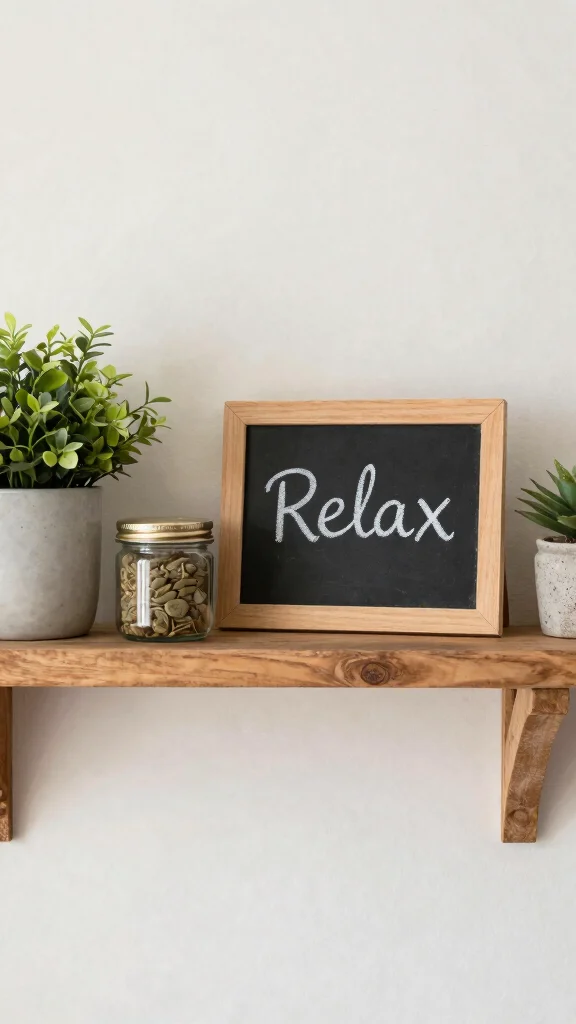 Chalkboard signs on your bathroom shelves can introduce a personal touch while serving as charming decor. Use these signs to label jars or baskets, or even jot down uplifting quotes to enhance your morning routine. The rustic allure of chalkboard paired with your shelving creates an inviting atmosphere.