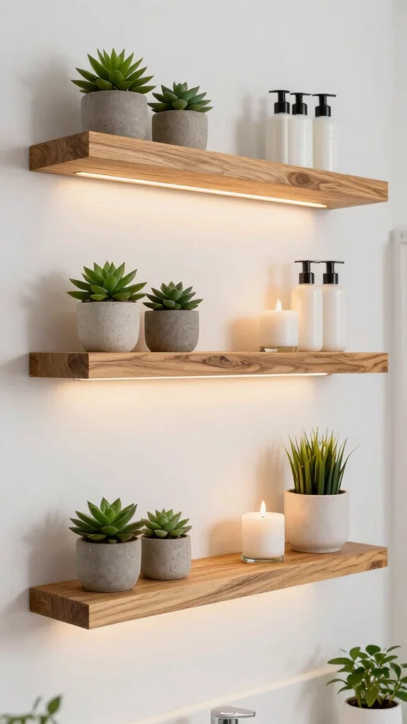 Floating shelves provide elegance and practicality, transforming your bathroom into a stylish retreat while keeping the space organized.