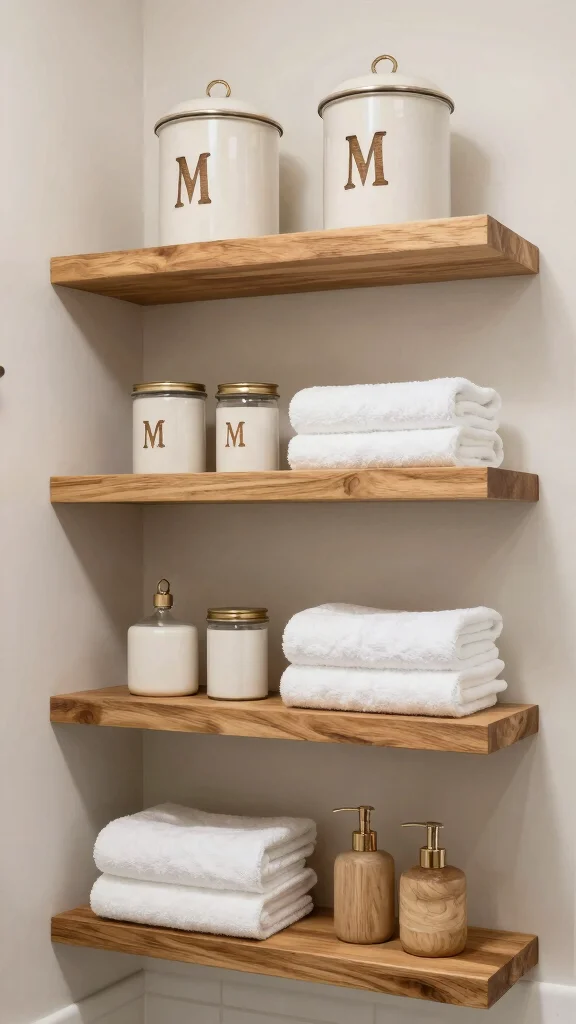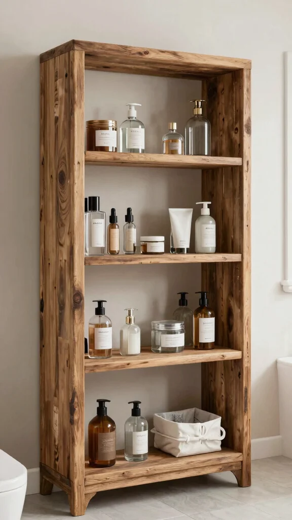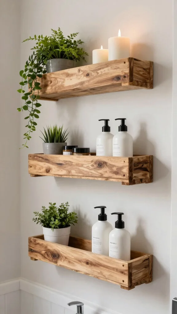 This approach blends decorative shelf ideas with stylish bathroom accents for a rustic vibe, while keeping your bathroom shelves decor looking intentional.