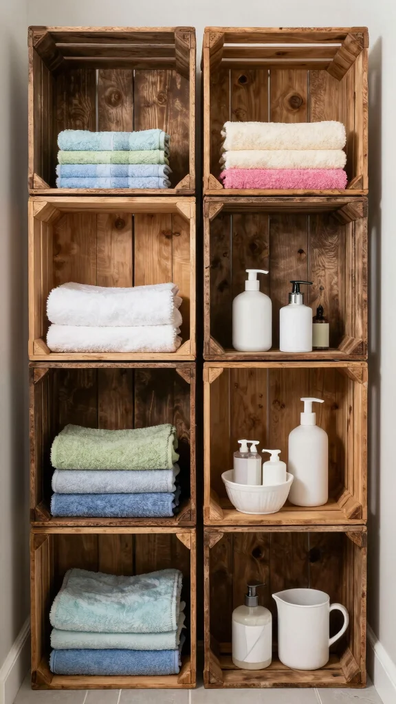 Repurposed crates add a distinctive flair to your bathroom, ensuring it feels personal and inviting.