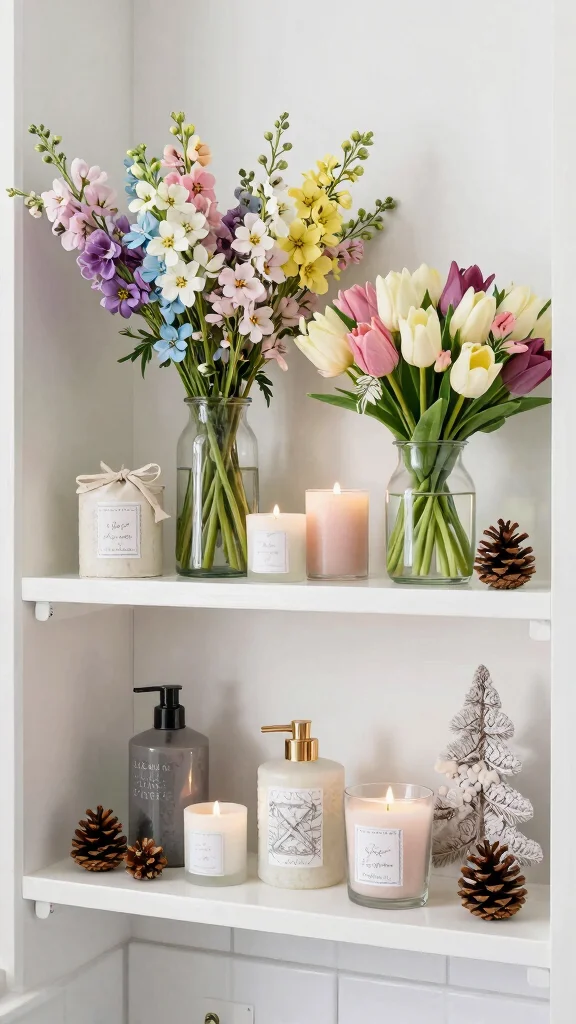 Refresh your bathroom with seasonal shelf decor that reflects the changing times of the year. This approach keeps your space looking vibrant and allows for creative expression throughout the seasons. In spring, display fresh flowers; summer can celebrate tropical accents; fall introduces warm tones; while winter can invite cozy elements like candles.