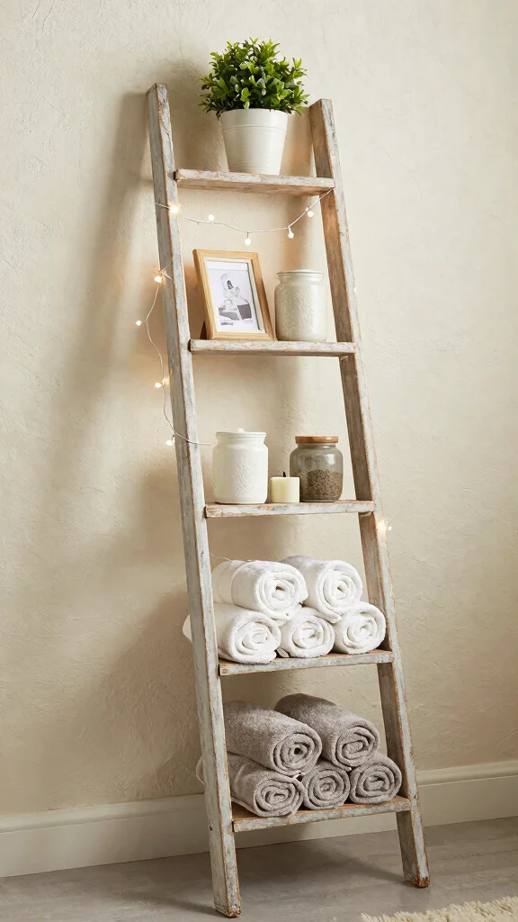 Utilize the top rungs for decorative accents like framed photos or mirrors, while the lower rungs can hold towels and toiletries within easy reach. Embrace a rustic feel by selecting a distressed wood finish, and pair it with vintage glass jars for a cohesive look that tells a story.