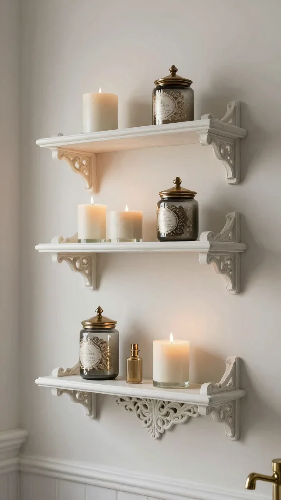 Fun fact: Well-chosen wall-mounted shelves can add up to 15% more perceived space in a small bathroom. Pair decorative brackets with a uniform color scheme, and a mirrored shelf boosts light and space—perfect for bathroom shelves decor without clutter.