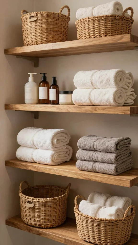 Incorporating basket storage on shelves marries visual appeal with functionality. Baskets add warmth and texture, making your bathroom feel inviting while keeping items organized. They are a perfect way to introduce a natural element into your decor.