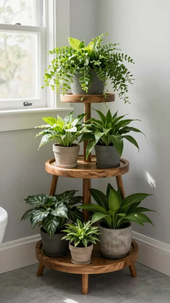 Opt for tiered corner shelves to elegantly display towels and decorative items. Incorporating plants can add a refreshing touch, while baskets keep everything tidy and organized. This combination creates a harmonious balance in your decor.