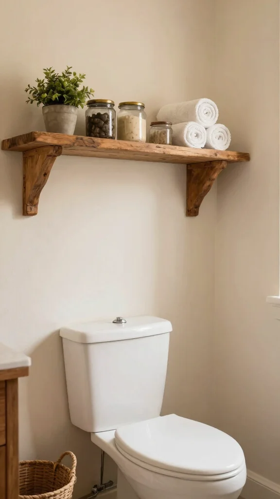 Rustic wooden shelves make a small bathroom feel cozy, not cramped. Pro Tip: choose warm reclaimed wood that harmonizes with your color palette, then add vintage jars and plants for instant bathroom shelves over toilet charm.