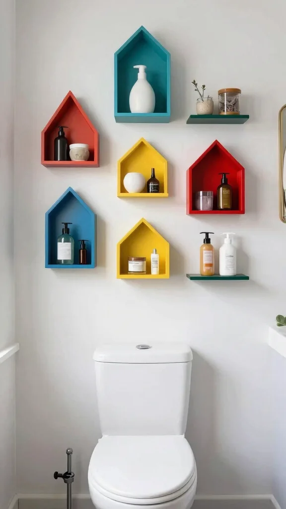 Enhance your bathroom with artistic wall-mounted shelves that serve as both storage and art. Unique shapes and designs can become focal points, adding character to the space while remaining functional.