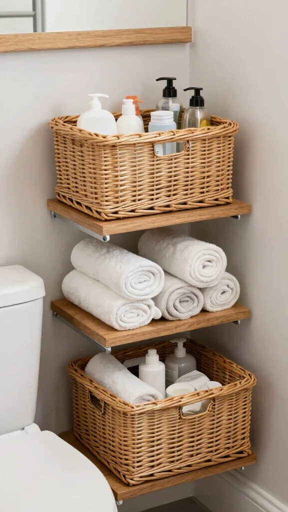 Utilizing open baskets on shelves creates an organized yet casual vibe in your bathroom. They allow for easy access to frequently used items while maintaining a tidy appearance.