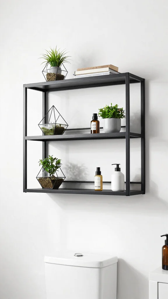 For a clean and modern vibe, sleek metal floating shelves are an excellent choice. Their minimalist design offers an industrial feel, making your bathroom appear more spacious and airy. Opt for finishes like matte black or brushed gold that beautifully complement your fixtures and enhance the overall aesthetic.
