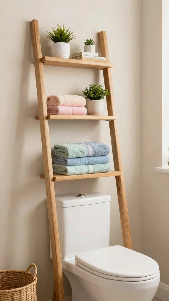 Ladder shelves are a stylish and functional choice that adds a unique flair to your bathroom. Leaning against the wall, they create an inviting atmosphere while providing ample storage for towels, toiletries, and decorative items like plants and candles. This design is perfect for maximizing vertical space in smaller bathrooms.