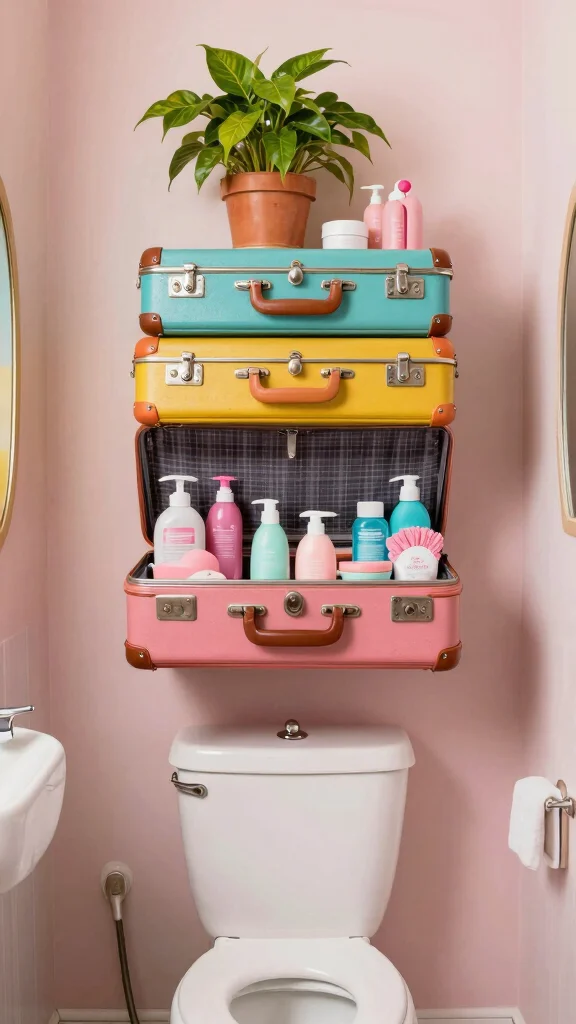 For a whimsical and quirky touch, repurpose vintage suitcases into stylish shelves. This creative option offers both decorative flair and storage, adding playful charm to your bathroom. Stack them or mount them on the wall for a fun and unique display.