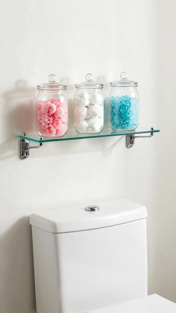 How can I organize toiletries and decor on over‑toilet shelves without clutter?