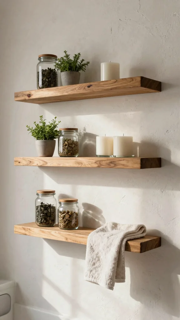 Rustic wooden floating shelves can bring a touch of nature into your bathroom while offering a cozy, organic feel. The charm of reclaimed wood creates a perfect balance between functionality and aesthetics, making it an ideal choice for displaying your favorite bath essentials or vibrant plants. Imagine the warmth of rich wood tones paired with soft whites or earthy greens, adding character and a welcoming vibe to your space.